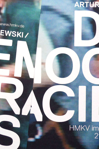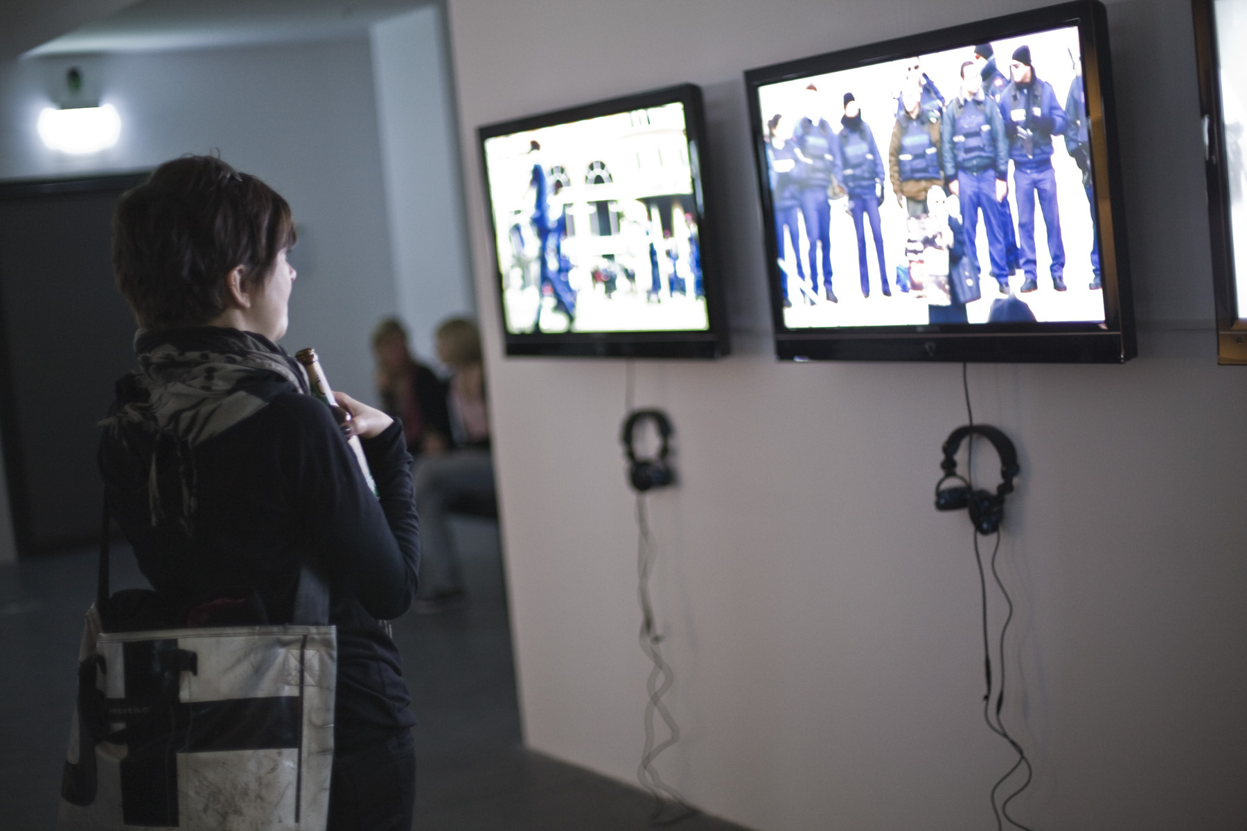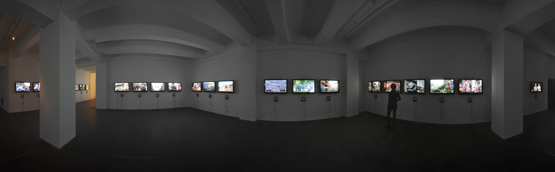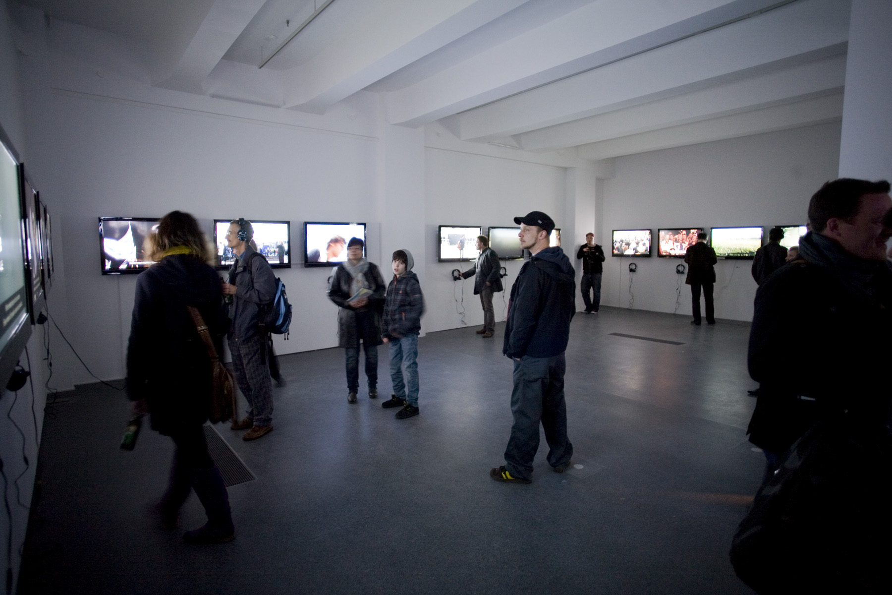 Die Installation "Democracies" (2009–2012) von Artur Żmijewski (*1966, Warschau) besteht aus 25 kurzen Dokumentarvideos, die politische Willensbekundungen und Meinungsäußerungen im öffentlichen Raum zeigen. Diese stellt der Künstler nebeneinander, ohne zu werten: Wir sehen Aufnahmen, in denen sich Menschenmengen auf Demonstrationen, Fußballfeiern, Beerdigungen, bei Kriegsspielen oder Militärparaden begegnen. Neben den Bildern ist der authentische Sound der jeweiligen Veranstaltung zu hören, der sich im Ausstellungsraum lautstark zu einer Kakophonie vermischt. Die BesucherInnen haben jedoch auch die Möglichkeit, per Kopfhörer die spezifische Tonspur zu einem einzelnen Video zu hören.