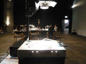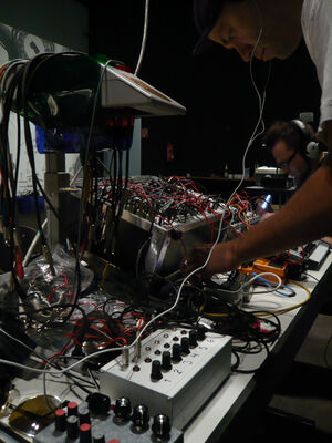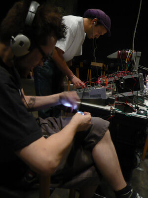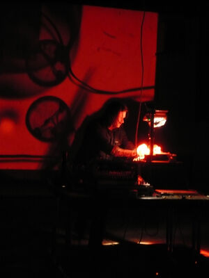 Tonewheels is an experiment in converting graphical imagery to sound, inspired by some of the pioneering twentieth-century electronic music inventions. Transparent tonewheels with repeating patterns are spun over light-sensitive electronic circuitry to produce sound and light pulsations and textures, while projected graphical loops and textures add richness to the visual environment. This all-analogue set is performed entirely live without the use of computers, using only overhead projectors as light source, performance interface, and audience display. In this way, Tonewheels aims to open up the ‘black box’ of electronic music and video by exposing the working processes of the performance for the audience to see.
