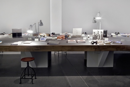 The table accommodating the INDUSTRIAL (Research) collection measures 22 metres in length. Plenty of space to lay out books, records, videos and objects, one would think. However, there are important portions of the researched materials which have not made it on the table – because curating means not only ordering and filing objects, documents and archives, but also operating a choice, making a selection, sorting things out.