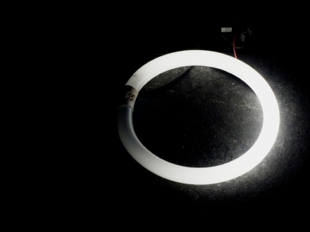 WARDEN SPRITES raum#1: Through an acoustic – echo-breaking and also optical Schleuse You enter a black painted space. A standing pressure sinus wave is structuring the invisible Euclidian architecture with an amorph field. Over a black table with a black mirrow top a normal fluorescentic circle tube like Dan Flavin also used but wireslesly wirering are hanging on nylon strings. You are entering the high frequency field and start to form it.