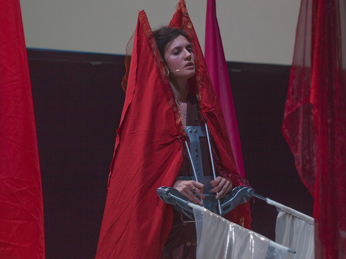 In Waves of Worship (WOW), Vanja Smiljanić once again appears in her position as a Minister of the Cosmic People for the countries of ex-Yugoslavia, Portugal and the former Portuguese colonies. Her perspective changes between a clairvoyant vision of a dystopian future in which the Cosmic People are in a cyber war against their primordial enemies, the saurians, and the present, in which she is a hardware developer establishing a defence system against hacker attacks. During the lecture performance, Vanja Smiljanić introduces various tools, flags and strategies, with which one can produce noise (white noise), encode digital data and occupy Internet space, and she reflects on the process of individualisation in cyberspace.