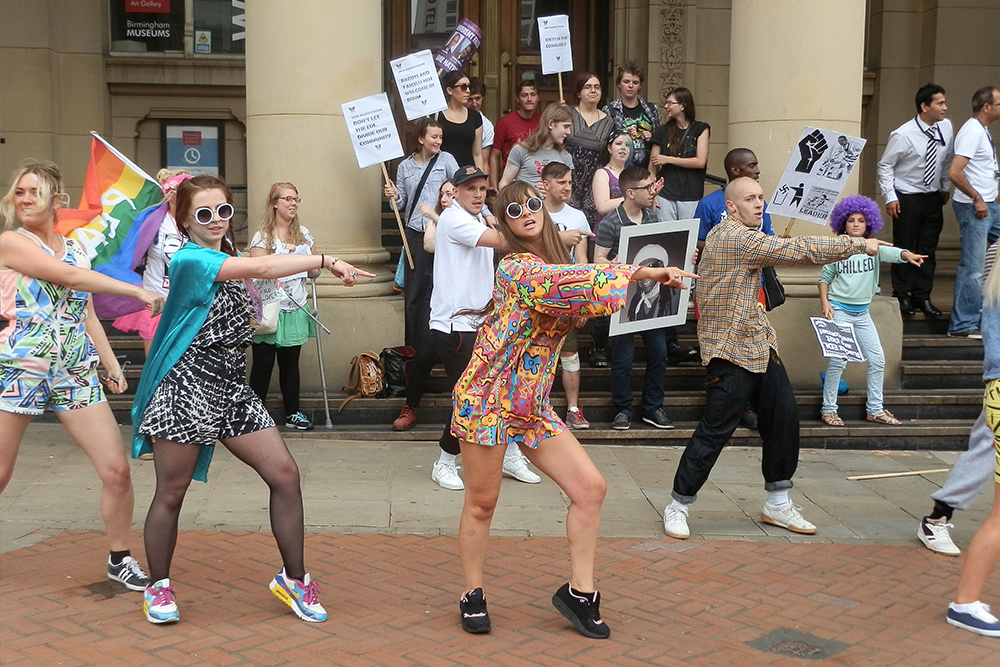 Chris Alton is a 24 year old artist and Quaker. In September 2012 he founded English Disco Lovers (EDL), a subversive social movement looking to reclaim the EDL acronym, most commonly associated with the English Defence League. His intention was to make the three letter abbreviation more synonymous with disco than ‘defence’, supplanting negative connotations with positive ones. Through their deployment of radical joy, in opposition to contemporary intolerance in the UK, the English Disco Lovers (EDL) have built at UK-wide network of collaborators and followers. Over the past three years they have occupied various spaces online and participated in street-level demonstrations up and down the UK and in 2013 they were shortlisted for the National Diversity Awards. The group currently run a series of club nights, where they spread their “Don’t Hate! Gyrate!” message and raise money for numerous causes, including; anti-racism, LGBT and refugee charities.