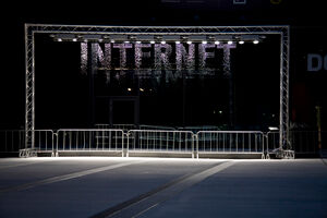 In der Installation bit.fall wird fallendes Wasser zu Sprache und Text: In einem riesigen Vorhang aus Wassertropfen bilden sich wie von Geisterhand Wörter, die nur für einen Sekundenbruchteil lesbar sind und sich im weiteren Fall sofort wieder auflösen. Die Wörter werden in Echtzeit mittels eines Algorithmus direkt aus dem Internet herausgefiltert und visualisieren für einen kurzen Moment, was um uns herum in der digitalen Realität geschieht.