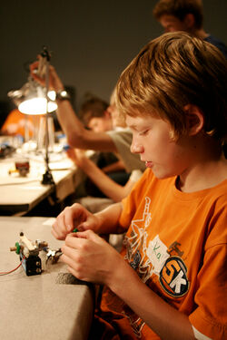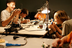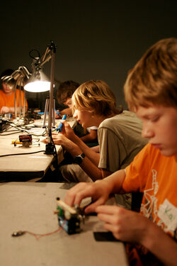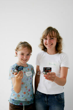 Beim Löten und Bauen werden Kompetenzen im Ungang mit Mikroelektronik erworben und auf der Basis des Bausatzes selbst erfundene Spiele zusammengelötet und programmiert.