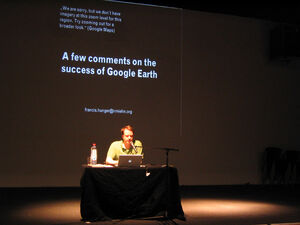 In seinem Einführungsvortrag diskutiert der Künstler und Kurator Francis Hunger einige geschichtliche Aspekte der Entstehung von Geodatensystemen und wirft Fragen zur Verwendung von Satellitenbildern und deren Kombination mit Nutzer-generierten Informationen auf. Er bezieht sich in seinem Vortrag auf die aktuellen Veröffentlichung der amerikanischen Professorin für Filmwissenschaften Lisa Parks, die 2005 das Buch „Cultures in Orbit“ veröffentlicht hat, das eine der ersten Untersuchung der Verwendung von Satellitenbildern in den Massenmedien darstellt.